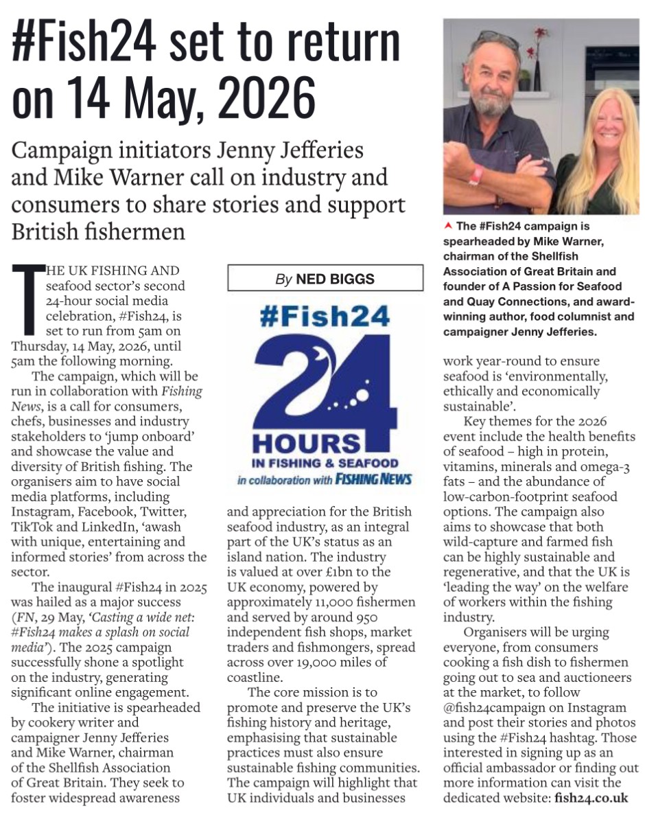 Mike’s work with A Passion for Seafood and the #Fish24 campaign has been featured across industry publications, highlighting his commitment to British fisheries and sustainable seafood.